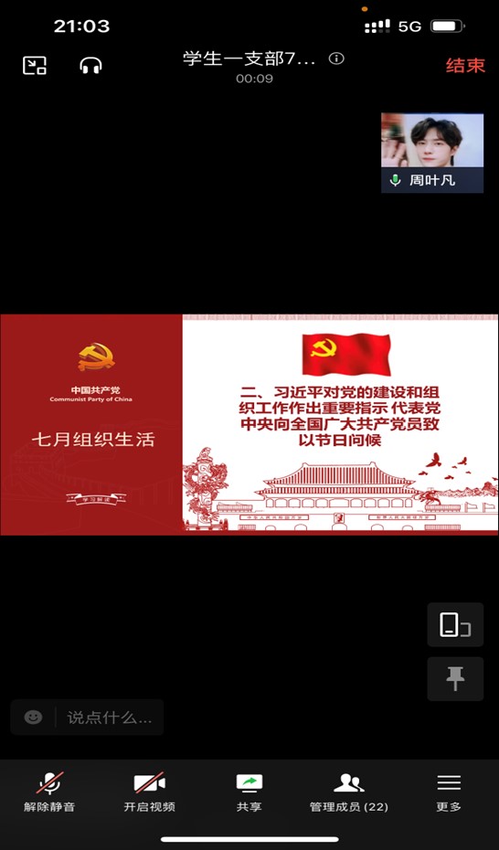 7月20日,我院学生一支部组织召开了“忆初心强党性,学思想见行动”为主题的七月组织生活会,会议以线上方式进行,围绕2个部分展开,由王娅秋同志主持,共计22名党员参会。