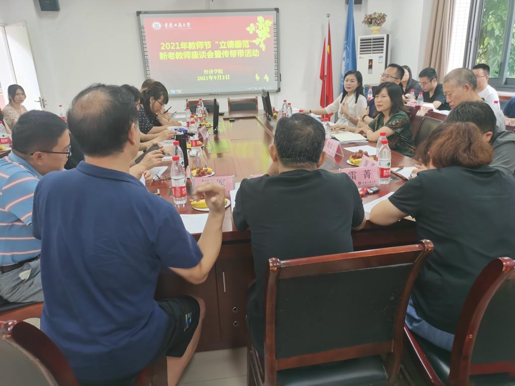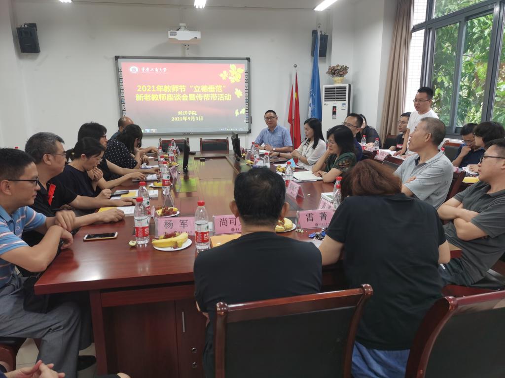 随后,新教师们进行了自我介绍,大家围绕师德师风、教育教学及人才培养等方面进行了热烈的讨论。长江学者谢新教授谈到经济学发展快速,是前沿学科,应多结合实务,开展教学与科研。学校督导专家刘成杰教授以自身经历语重心长地阐述了三点,一是遵守教学制度是教师的底线,二是处理好教学与科研的关系,三是认真学习职称文件,文件精神是一种导向,有利于激励我们奋发图强。学校督导杨军副教授则从教学督导的角度出发,为青年教师提出“上好课”的基本标准与要求,帮助青年教师厘清了自己走上三尺讲台的首要任务。重庆市教指委委员尚可文教授分别从如何处理好教材与教学、教书与教课、教材语言与教学语言三方面的关系传授了自己宝贵的教学经验,将艰深难懂的教学理论娓娓道来,让在座的教师如沐春风,受益匪浅。学院王燕副书记以就业为主线,从真心、恒心、诚心、爱心、耐心五个点勉励青年教师找准个人定位,坚持不懈,努力进取。重庆市教指委委员朱莉芬教授表示新老教师应相互交流、相互学习、共筑成长。青年教师代表郭鹏飞也在座谈交流中发言,大家纷纷对老教授们的谆谆教诲表示感谢。