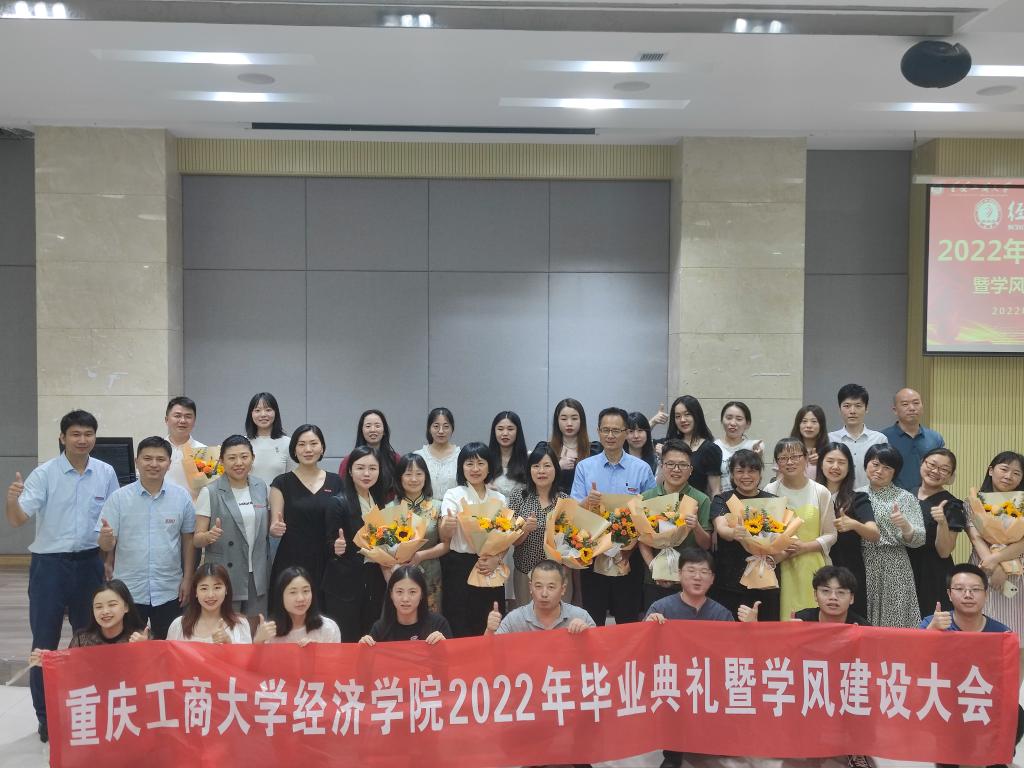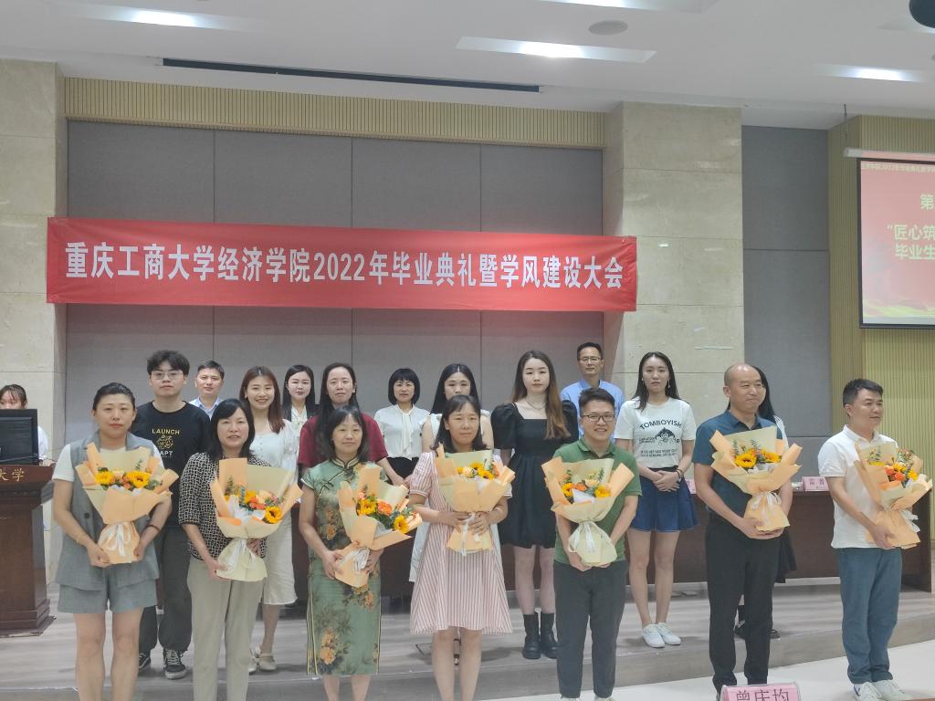 大会在庄严的国歌声中拉开帷幕。第一阶段为2022年毕业典礼,学院党委书记李自维教授发表致辞并对同学们寄予祝福:一是希望全体毕业生以梦为马,不负韶华,树立终身学习的理念,奏响时代的最强音;二是希望同学们不忘初心,砥砺前行,感恩父母,报效祖国;三是希望在校学生能以优秀的学长学姐为榜样,取得更优异的成绩。学院巴渝学者、重庆市人民政府特聘专家谢新教授进行毕业寄语。谢教授以专业的经济学理论知识为同学们送上了一份特殊的记忆,鼓励同学们利用好经济学知识和更高的个人素养这两把利剑,将创造市场价值的核心专业知识学以致用。重庆市优秀毕业生代表郭南冰回顾四年大学时光和成长历程,寄语学弟学妹要利用好有限的四年开拓更多的道路,最后表达了对学校、学院的不舍和祝福。我院副院长尹元福宣读2022届优秀毕业生名单并由与会领导为重庆市优秀毕业生代表颁发证书。学院校友会成员为毕业生代表赠送“院训书签”和颁发“校友徽章”。国贸、贸经专业学生代表全体毕业生为学院赠送学校70周年毕业纪念品。最后由毕业生代表为以2021年优秀党员、优秀党务工作者代表和优秀教师、优秀教育工作者组成的教师代表献上鲜花和祝福。