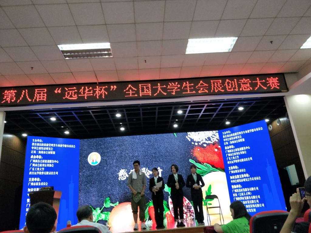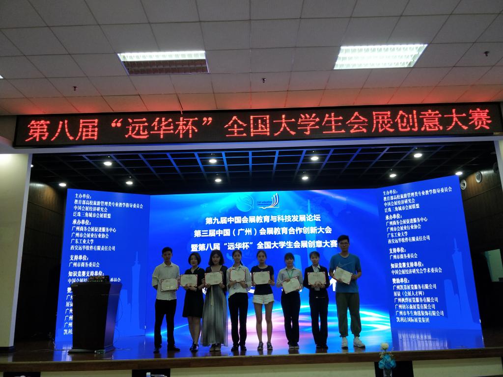 2018年5月24日至5月26日,由教育部高校旅游管理类专业教学指导委员会、中国会展经济研究会共同主办的第八届“远华杯”全国大学生会展创意大赛”在广东工业大学龙洞校区隆重举行。本次大赛吸引了来自全国近50所高校的55支参赛队伍,我校13名学生组成的2支队伍参加了创意策划组的比赛,经过紧张激烈的角逐,最终分别获得了二等奖和三等奖的好成绩。