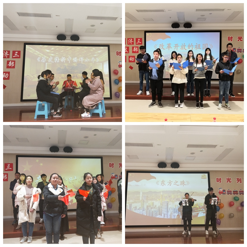 本次活动在主持人的宣布正式开始后,同学们齐唱团歌,在雄雄的团歌声中,大家一同乘坐时光列车,一同回首了改革开放四十年以来的变化。滴滴滴,在时光列车的第一站,话剧表演《历史转折中的邓小平》让大家感受到了改革开放初期的不易,更加珍惜今日的成就;滴滴滴,在第二站,同学们用小合唱《走进新时代》向大家展示了改革开放中人们的欢快喜悦;第三站,李宜轩同学和张晓晗同学的曲艺表演《东方之珠》让大家真是感受到了国家实力的变强,经济实力的不断提升;在列车停靠期间,进行了《一站到底知识竞赛》,让大家更加了解改革开放的历史事件,在这一环节,同学们的参与度极高;激烈的知识竞赛后,时光列车继续前行,来到改革开放的第四站,在改革开放四十周年之际,同学们满怀激情的朗诵了《改革开放的中国》让大家更加充分认识了解了这四十年以来的成就。紧随其后的曲艺表演《三句半》让同学们更加了解改革开放四十周年来在经济、文化等方面的巨大变化以及成就。经过了这几站,同学们积极踊跃的发表了自己的一些看法,并对祖国的未来发展抱以极大的信心,相信祖国会越来越好。在团日活动的结尾播放了同学们精心准备的感言视频,结束了这次旅行。最后,于频副书记对此次活动进行了点评,她认为:此次活动紧扣主题、内容丰富,节目编排上很有新意,而且同学们参与度很高,利用团日活动的舞台展示了同学们话剧、演奏、唱歌、朗诵、绘画等多方面的才艺,给了我们很多的惊喜,鼓励同学们接下来将参与活动的热情延续到接下来的学习、考研等方面,在改革开放的进程中展示自己的风采。