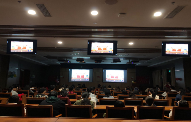 11月4日晚19:40,我院党员服务站在新图书馆第一会议室组织开展党员学习活动,传达学习党的十九届四中全会精神,本次活动由学院副书记于频主持,近百名学生党员参加了学习。