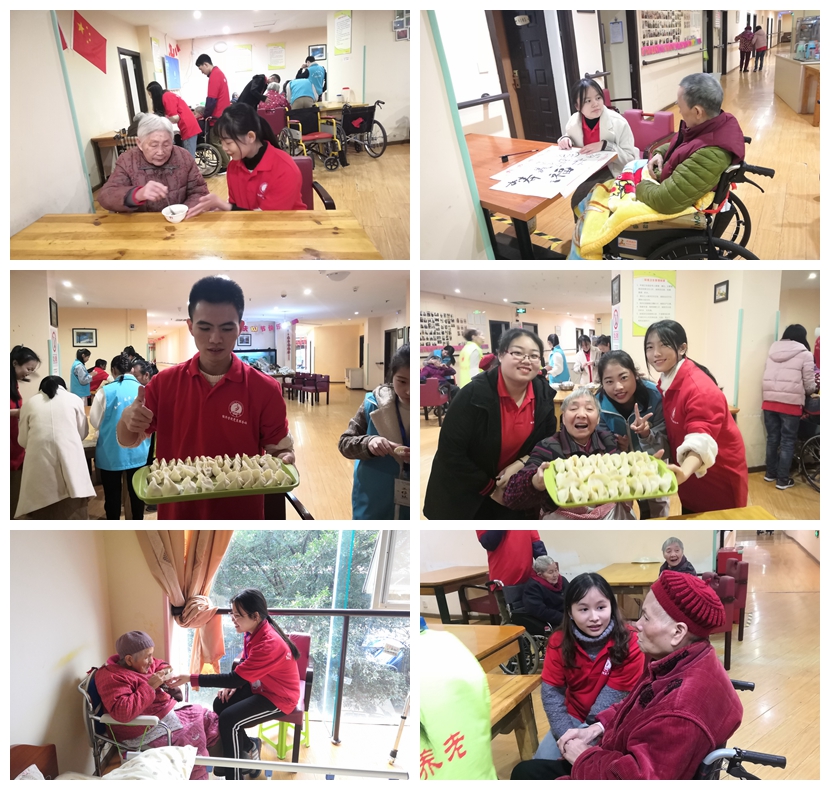 14点30分,经济学子们帮助刚午休完毕的老人们起床、穿衣、带老人们在房间里走动,活动身体。随后,一部分同学陪同老人们的同时,另一部分同学开始为老人们包饺子,煮饺子。在养老院工作人员的介绍和帮助下,同学们都尽量根据老人们的喜好和身体状况进行服务,有的为老人按摩;有的陪老人下棋;有的陪老人唱歌;有的听老人唠家常……。饺子煮好后,我院的同学们便为老人们盛好饺子并喂老人们吃。我院党员服务站成员热情洋溢,对老人们关心体贴,老人们脸上也都洋溢着幸福的微笑,同学们也满心欢喜。16点30分,此次聚福岛养老院志愿服务活动圆满结束。