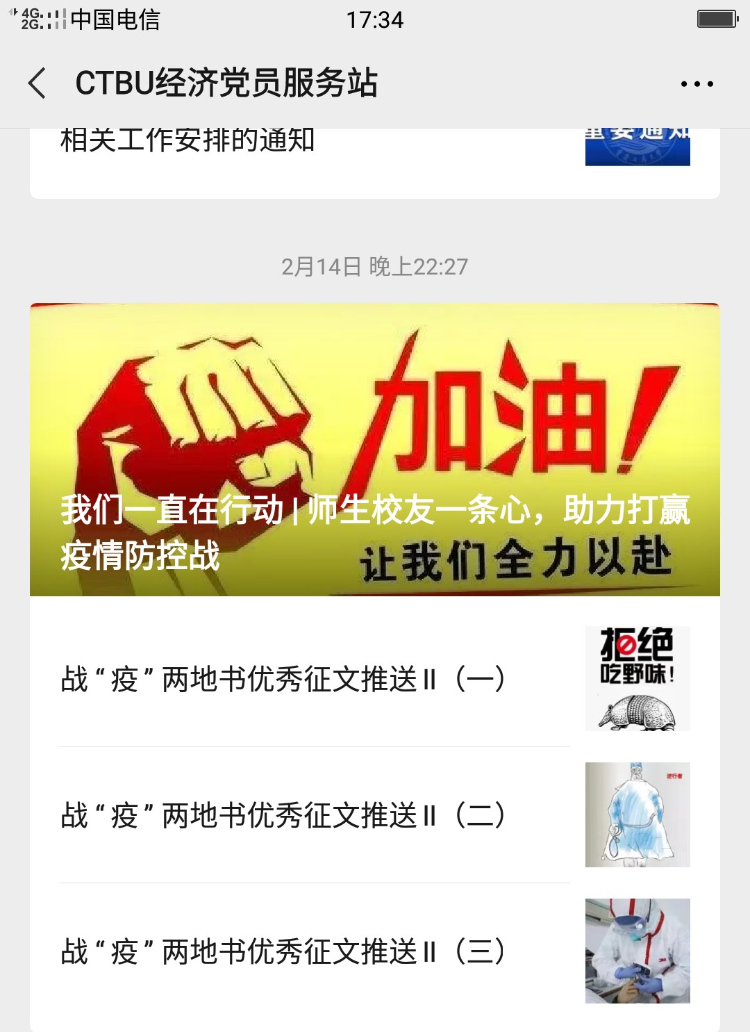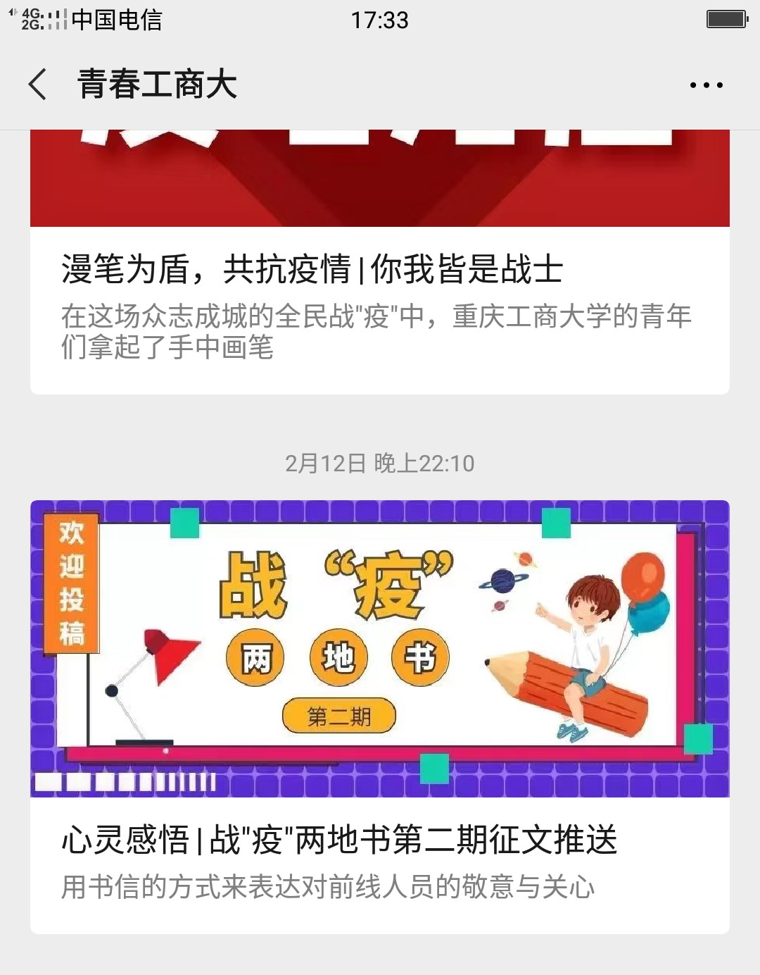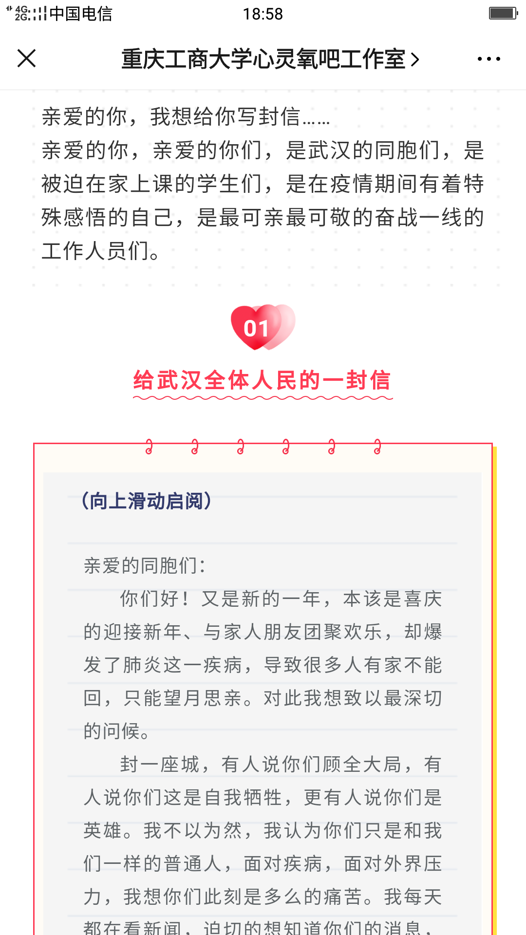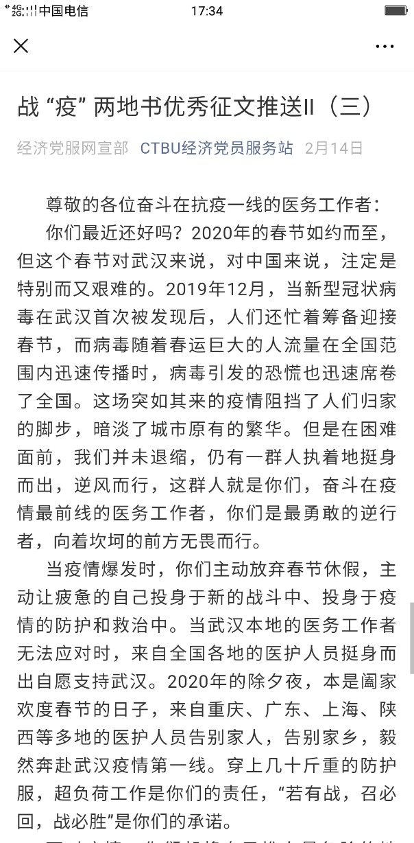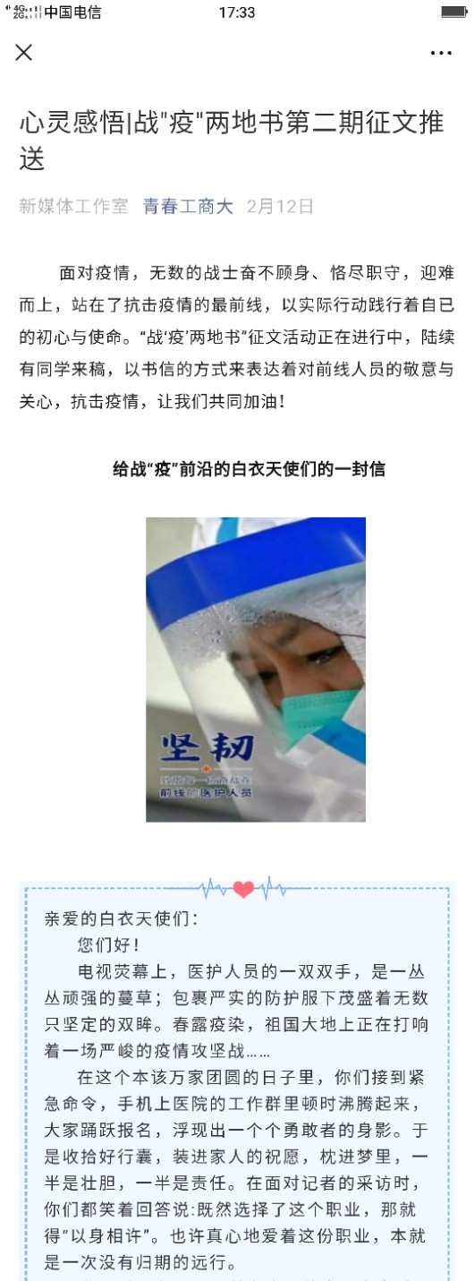 自新冠疫情发生以来,学校学工部、校团委、我院联合主办“战‘疫’两地书”活动,以“给......的一封信”的书信形式,征集原创、尚未公开发表征文,给奋斗在一线的广大医护人员、基层干部或湖北、武汉的同学们送去温暖与正能量。
