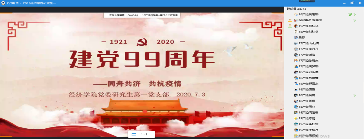 7月3日下午15点,我院党委研究生第一党支部在线上成功举办以“同舟共济、共抗疫情”主题的抗“疫”故事分享会。本次大会由组织委员饶晓萍主持,研究生第一支部全体党员参加此次活动。此次活动旨在持续加强支部建设,切实发挥党组织优势,教育引导师生党员进一步担当起来,坚定信心、经受考验,发挥党员先锋模范作用。大会进行,由黄旭婷同志分享我院分党委研究生第一支部的党员同志的抗“疫”故事。
