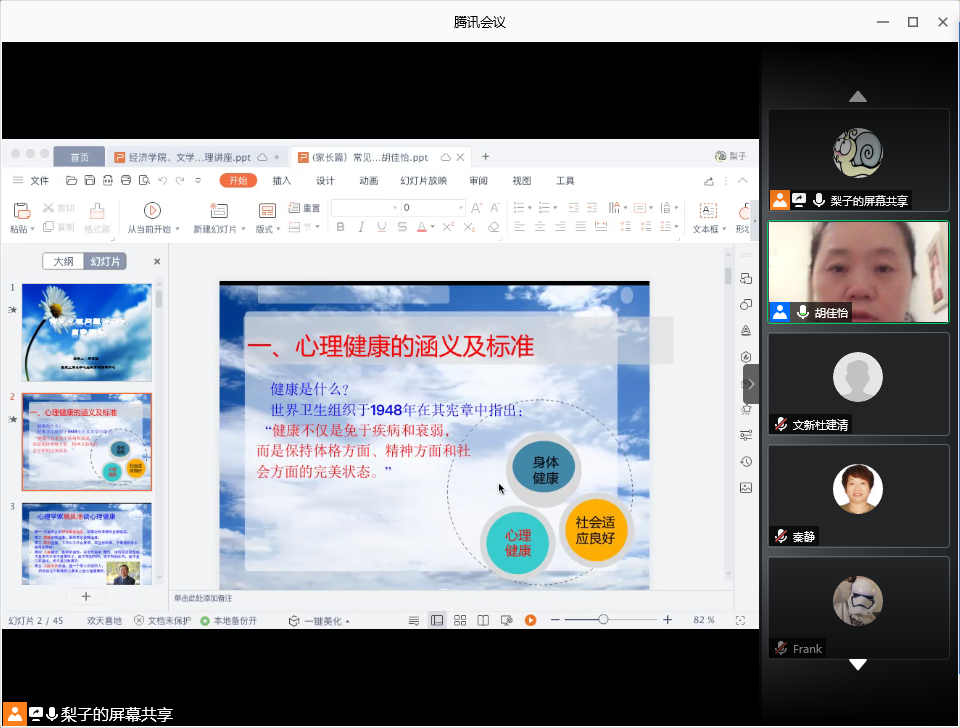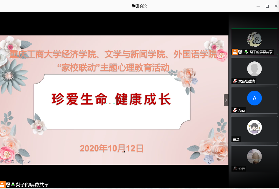 为加强家校联系,共同维护学生心理健康,2020年10月12日晚19:00,我院、文学与新闻学院和外国语学院共同举办“珍爱生命·健康成长”家校联动心理教育线上主题活动。活动邀请了365英国上市公司大学生心理健康教育与咨询中心副主任,国家二级心理咨询师胡佳怡老师作心理专题讲座,、我院分党委副书记、副院长王燕教授,文新学院分党委副书记程元元、外语学院分党委副书记吴欢欢及部分学生家长共同参加了此次活动。