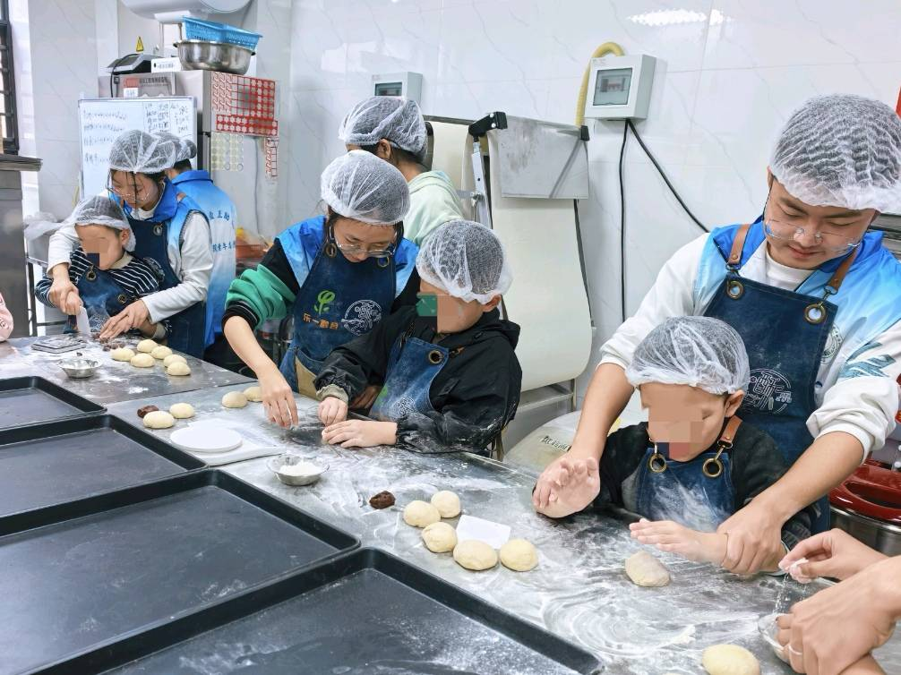 在专业烘焙教师的指导下,志愿者们认真学习了小面包的制作流程,然后手把手地帮助孩子们制作小面包。孩子们在志愿者们的协作帮助下,通过“揉、捏、搓、点”等手法将面团制作成小面包。在等待小面包烘烤的过程中,伴随烤箱中弥漫的麦香,志愿者与孩子们围绕小面包的味道和形状展开讨论,提升他们的语言表达能力。