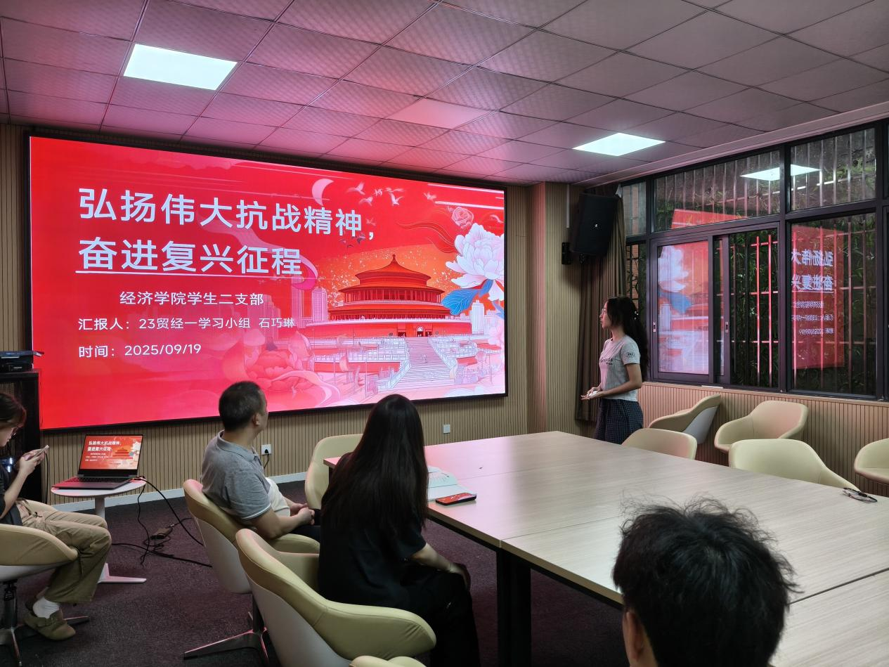 在理论学习环节,22贸经一班党员学习小组严镔莹领学习近平总书记近日作出的重要指示精神,锲而不舍落实中央八项规定精神,推进作风建设常态化、长效化。她谈到,习近平总书记强调,党的作风就是党的形象,关系人心向背,关系党的生死存亡。要持续抓好中央八项规定精神贯彻落实,进一步下大气力把党建设好,打造一支党性纯洁的队伍、纪律严明的队伍,使我们党始终不负人民,团结带领人民顺利完成所肩负的历史使命。22贸经二班党员学习小组赵顺晶领学习近平总书记在纪念中国人民抗日战争暨世界反法西斯战争胜利80周年大会上的讲话精神,她谈到,习近平总书记在讲话中指出,中国人民抗日战争是艰苦卓绝的伟大战争,在中国共产党倡导建立的抗日民族统一战线旗帜下,中国人民以铮铮铁骨战强敌、以血肉之躯筑长城,取得近代以来反抗外敌入侵的第一次完全胜利。中国共产党的坚强领导是中国各项事业取得胜利的关键。