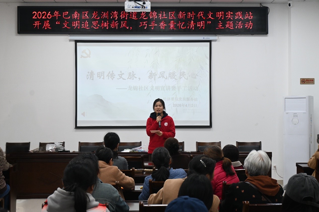 为进一步传承中华优秀传统文化,弘扬文明祭祀新风,4月2日下午,我院党员服务站联合学生第一党支部,携手巴南区龙锦社区在党群服务中心成功举办“清明传文脉,新风暖民心”主题文明宣讲暨手工活动。本次活动由24级税收班温乐怡主持,吸引了30余名党员服务工作站成员与40余名社区居民热情参与。