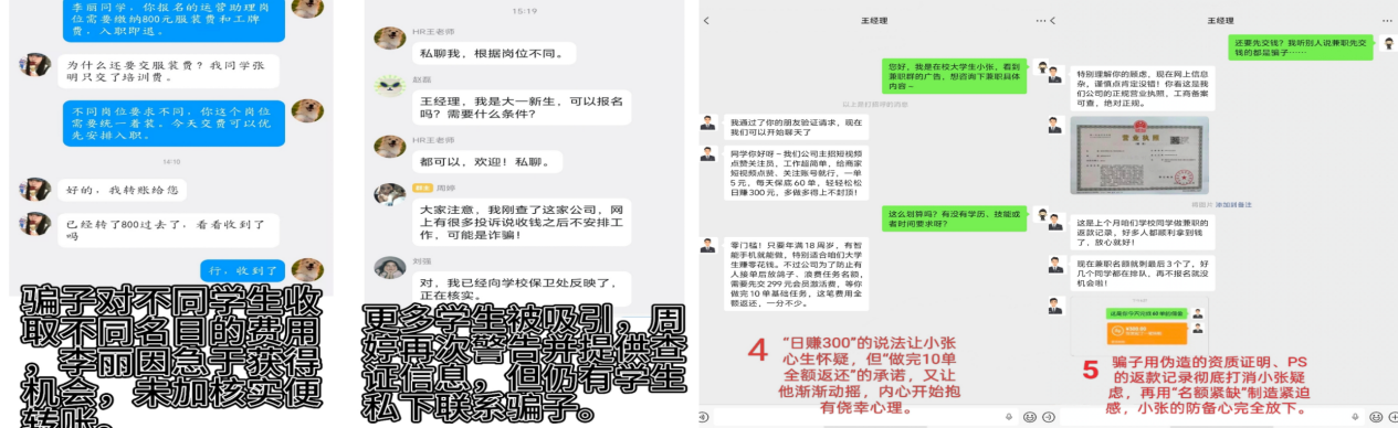 活动前期,各小组围绕既定诈骗主题,联系校园生活实际,结合典型案例共同策划情景剧场,同时以聊天界面截图为主要呈现载体,既真实还原了诈骗场景,又兼具教育意义。有的小组聚焦诈骗分子的作案手法,层层拆解其套路话术,凭借逻辑严密的剧情形成强烈警示,让诈骗伎俩无所遁形;有的小组在还原真实骗局场景的基础上,巧妙融入反诈提示与破解方法,将防骗知识融入“情景”之中,实现学用相融;还有的小组着重打磨情节张力与传播效果,以生动有趣的故事引发观众深度共鸣,让反诈理念深入人心。
