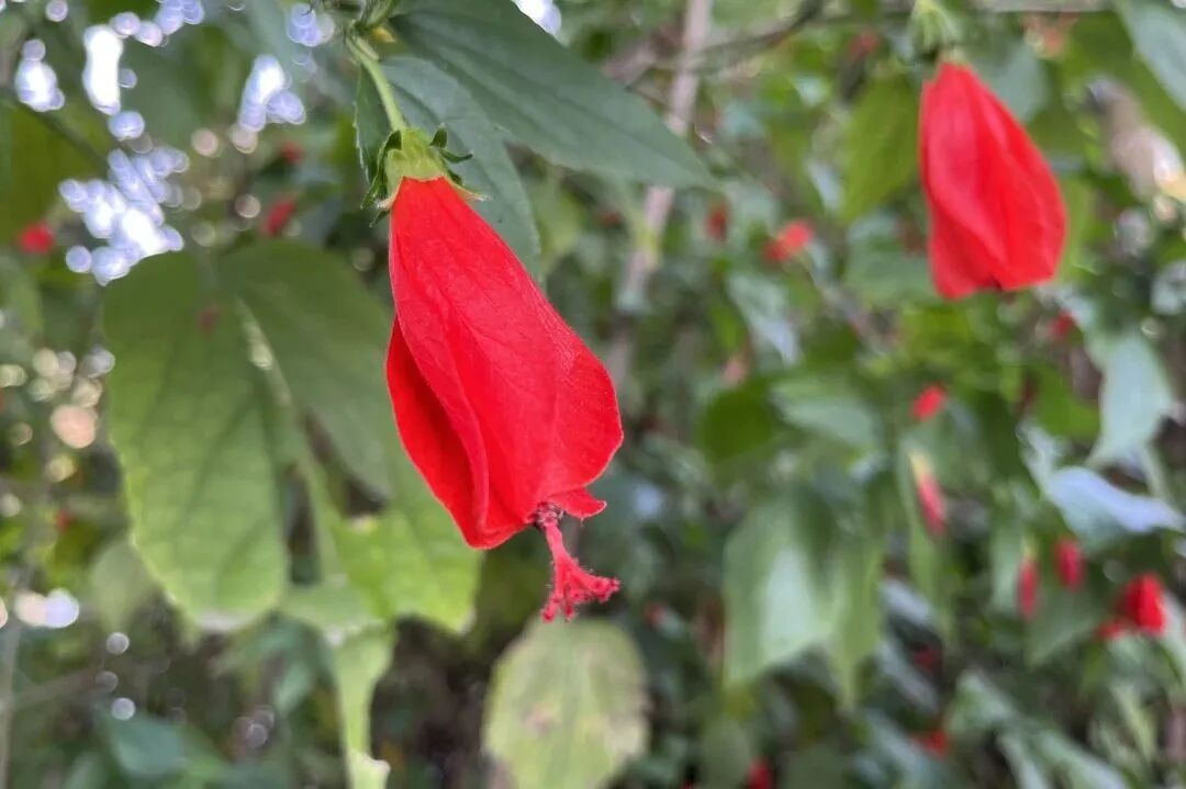 垂花悬铃花,别名南美朱槿、灯笼扶桑、卷瓣朱槿。原产于古巴、墨西哥和哥伦比亚。垂花悬铃花的花朵像悬挂在藤蔓上的小风铃,一直是含苞待放的状态,花瓣永远不会打开,因此又被称为永不开放的花。
