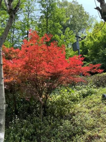 红枫为槭树科落叶小乔木,植株高度一般在2-4米,性喜阳光,适配温暖湿润的气候环境,在校园的水土条件中长势良好。其最鲜明的特征是叶片四季皆呈红色,春季发芽时红得艳丽夺目,夏季叶片渐变为紫红色,即便冬日叶片枯萎,也依旧保持着暗红色调,四季红韵,各有风姿。