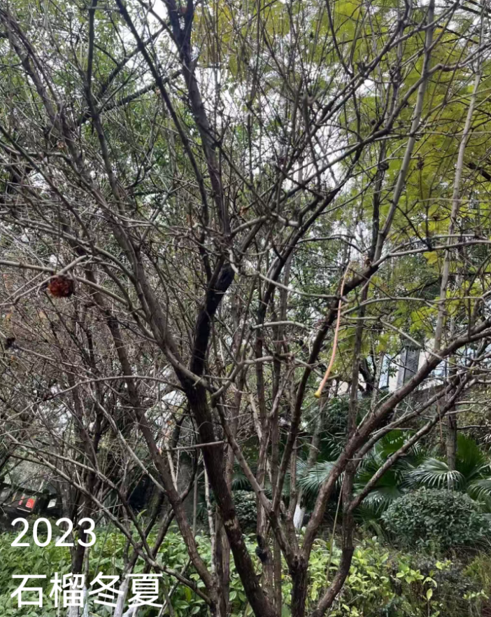 石榴原产西域,本名安石榴,经丝绸之路辗转传至中原,为落叶灌木或小乔木,树姿优美,株高可达2-4米。其生性强健,喜光耐寒,对生长环境适应性较强,每年五六月间繁花盛放,花色火红鲜艳,结出的石榴果实亦呈热烈的火红色,是校园中极具观赏性的植物。