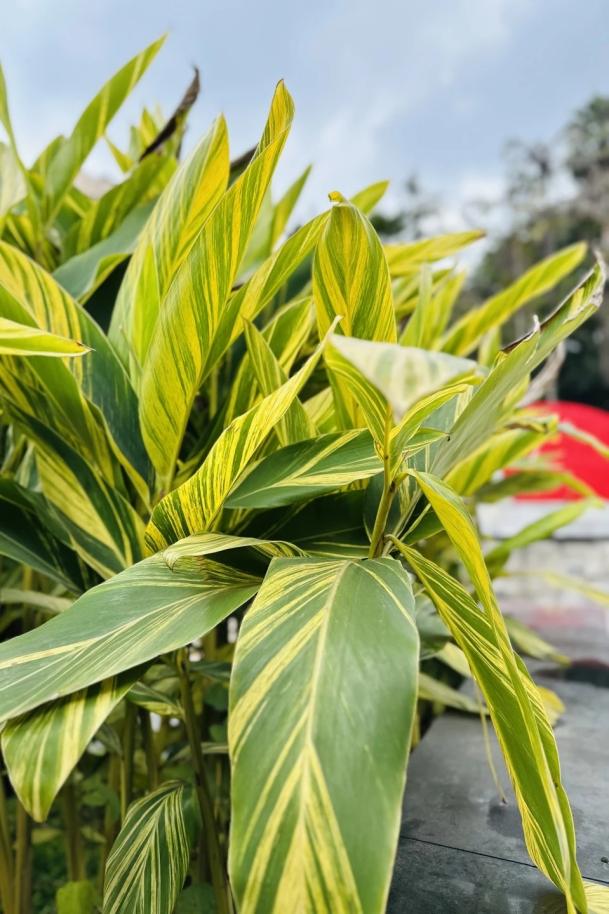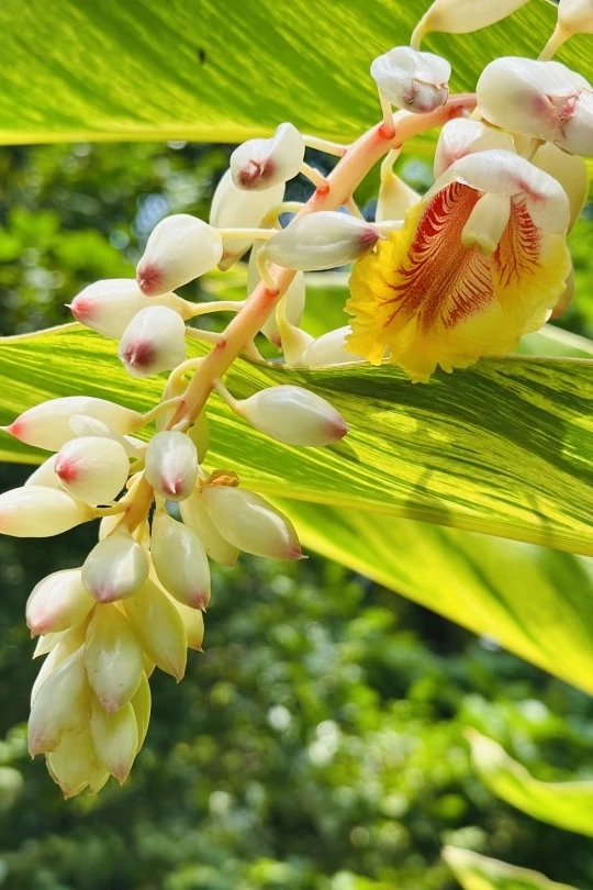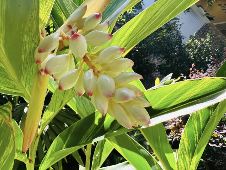 花叶艳山姜是极具美感的观叶观花植物,叶片上的金黄色纵纹线条优美、层次丰富,在阳光下熠熠生辉,整株叶片灵动雅致。它的花姿同样动人,数枚花苞组成圆锥形总状花序,自然下垂的模样楚楚动人,花苞饱满水润,一捏便会滴出水珠,用“娇艳欲滴”形容恰如其分,更易让人联想到“犹抱琵琶半遮面”“娉娉袅袅十三余”等优美诗句,也正因这份婉约之美,它的花语被赋予:羞涩、矜持。